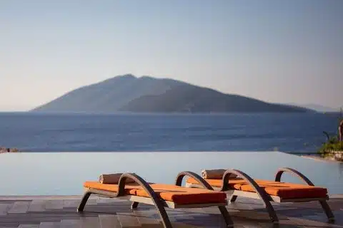 A private beach and infinity pool overlooking the sea.