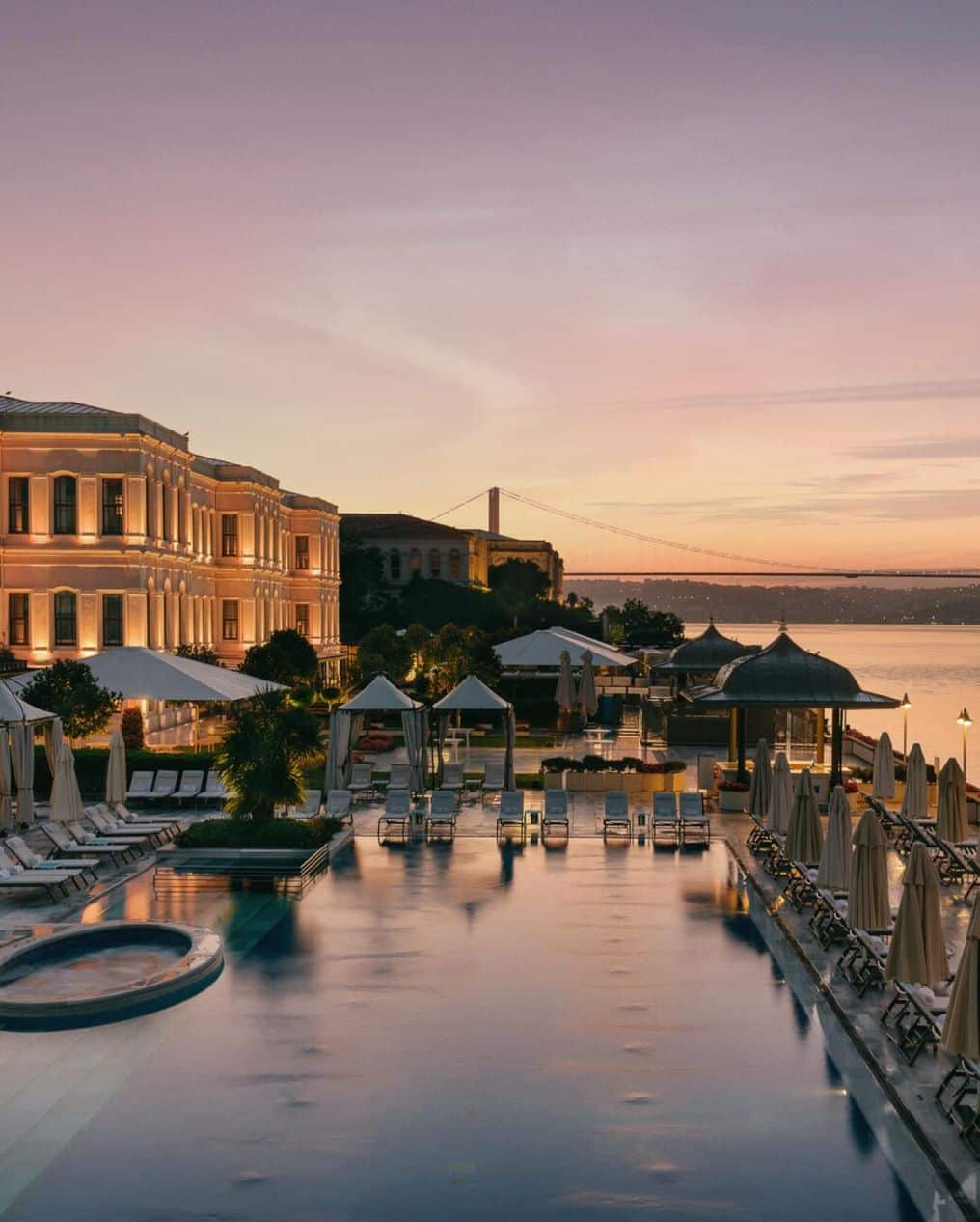 The hotel is housed in a restored 19th-century Ottoman palace right on the Bosphorus, giving your wedding a dramatic historic backdrop and breathtaking water views. The Bosphorus Strait — with its shimmering light and skyline — naturally elevates both ceremonies and photos.